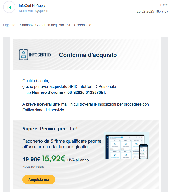 In questa prima mail è presente il numero d'ordine (es. 55-S2025-XXXXXXXXX) associato al tuo acquisto SPID InfoCert ID.