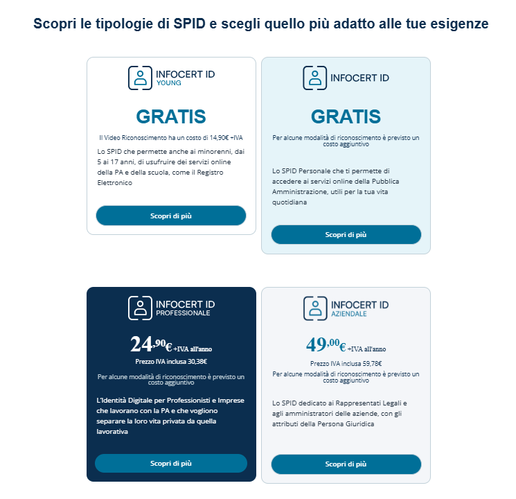 Scorrendo la pagina si arriverà alla selezione dello Spid Personale, cliccare il tasto Scopri di piu’ per proseguire.