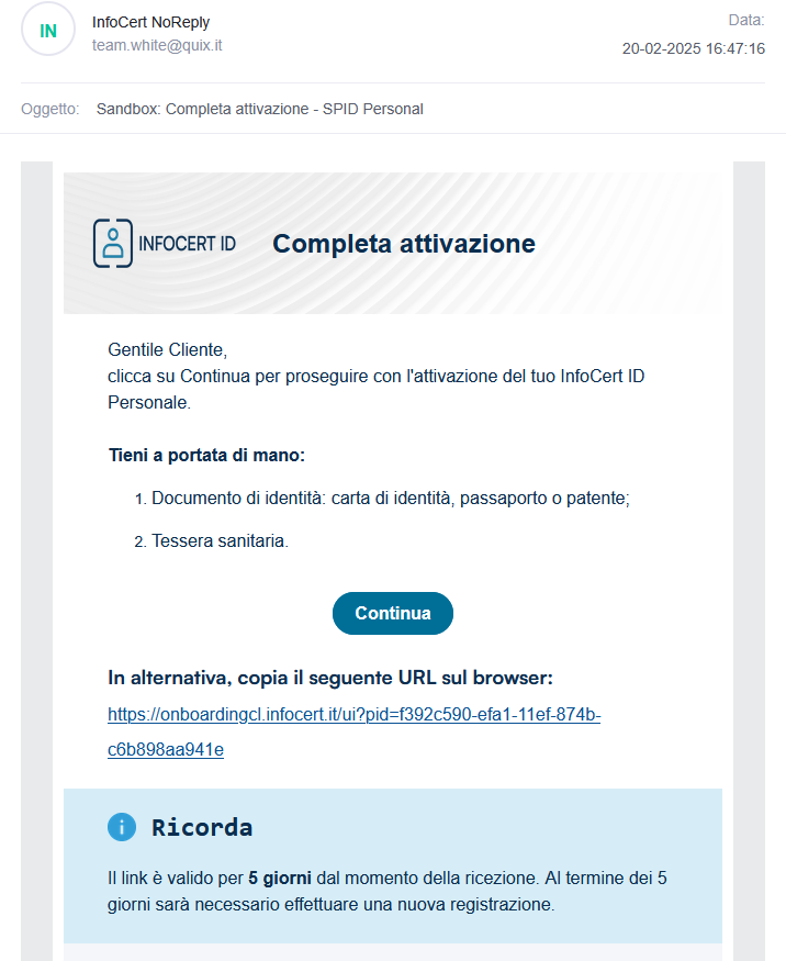 Questa mail fornisce il link per accedere alla fase di registrazione e attivazione del tuo futuro account SPID InfoCert ID.