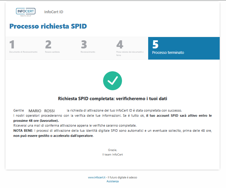 Da questo momento InfoCert, in qualità di Gestore di Identità Digitale, procederà con la verifica dei dati inseriti attenendosi ai tempi previsti per l’erogazione del servizio.