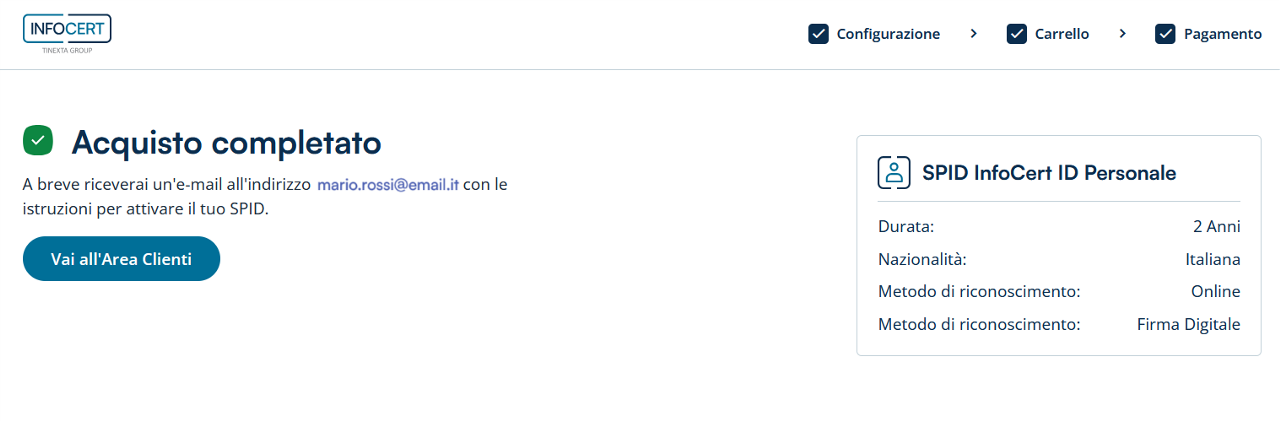 A breve riceverai 2 comunicazioni all'indirizzo mail associato all'account (Area Clienti) InfoCert utilizzato per fare l'ordine: