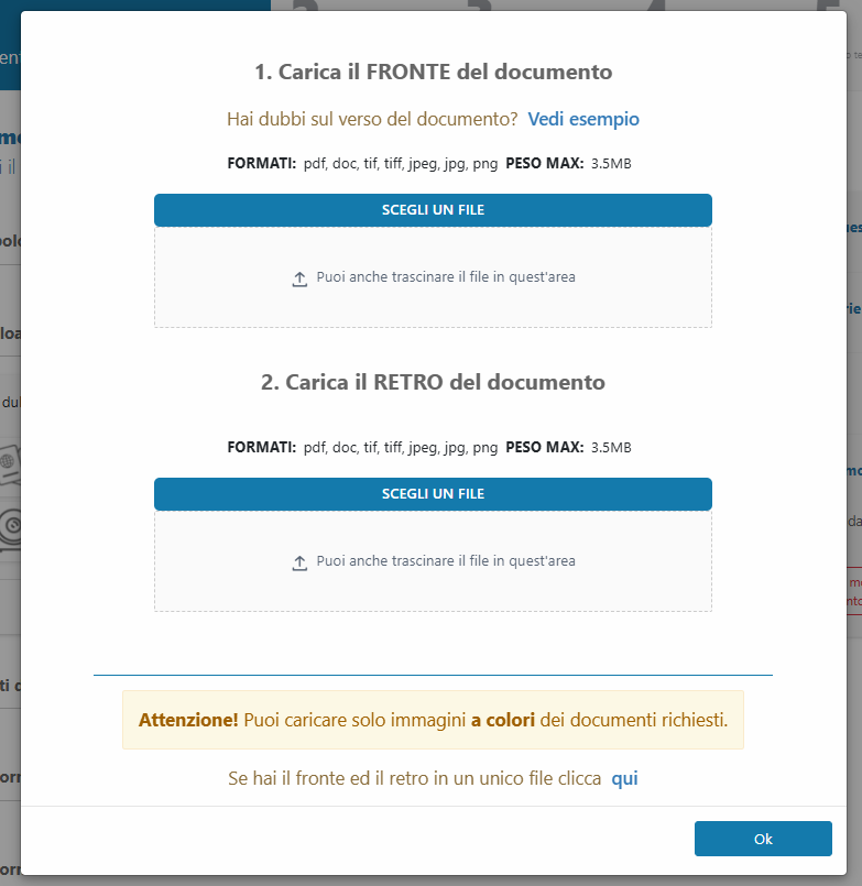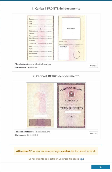 Se si è scelto di caricare il file con le immagini del documento, si potrà scegliere se allegare due files FRONTE e RETRO o un solo file con entrambe le facciate del documento. (*)