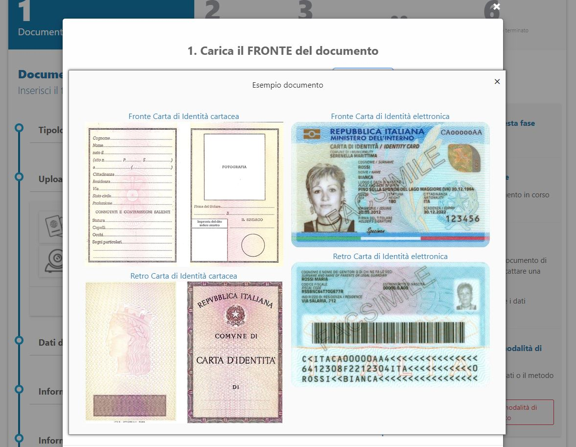 La fase 1 consiste nell’inserimento del proprio Documento di Riconoscimento con l'acquisizione delle immagini (a colori) del documento di identità, in corso di validità, con il quale si desidera effettuare la registrazione.