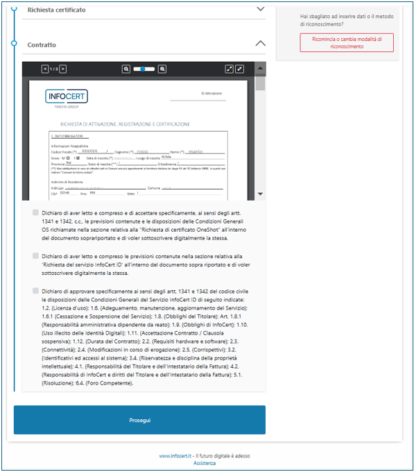 La sezione "Contratto" mette a disposizione la richiesta e permette di visionarla. Dopo aver barrato le opzioni relative all'accettazione delle clausole contrattuali previste, continuare con un clic sul pulsante Prosegui.