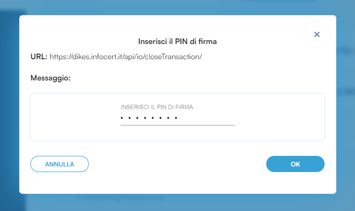 Dopo aver selezionato il certificato, convalidare la scelta con un clic sul pulsante Prosegui e inserire il PIN del proprio dispositivo e proseguire con un clic sul pulsante OK.