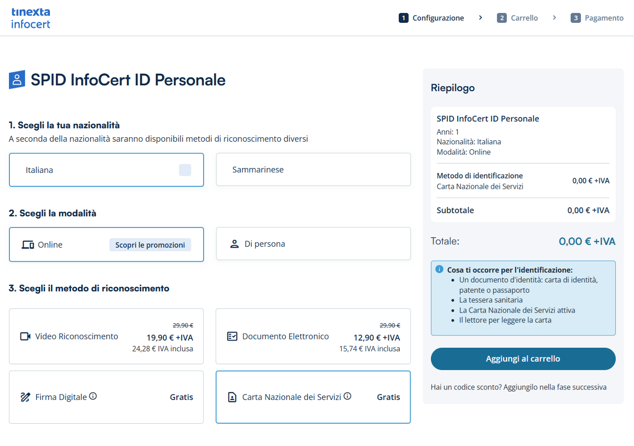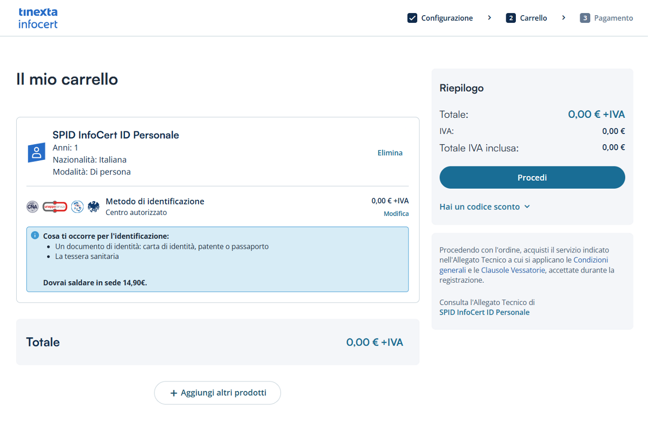 Seleziona il riquadro Centro Autorizzato (CNA, UNAPPA, CAF) e fai clic su Aggiungi al carrello.