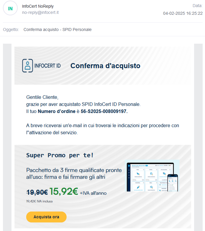 In questa prima mail è presente il numero d'ordine (es. 55-S2025-XXXXXXXXX) associato al tuo acquisto SPID InfoCert ID.