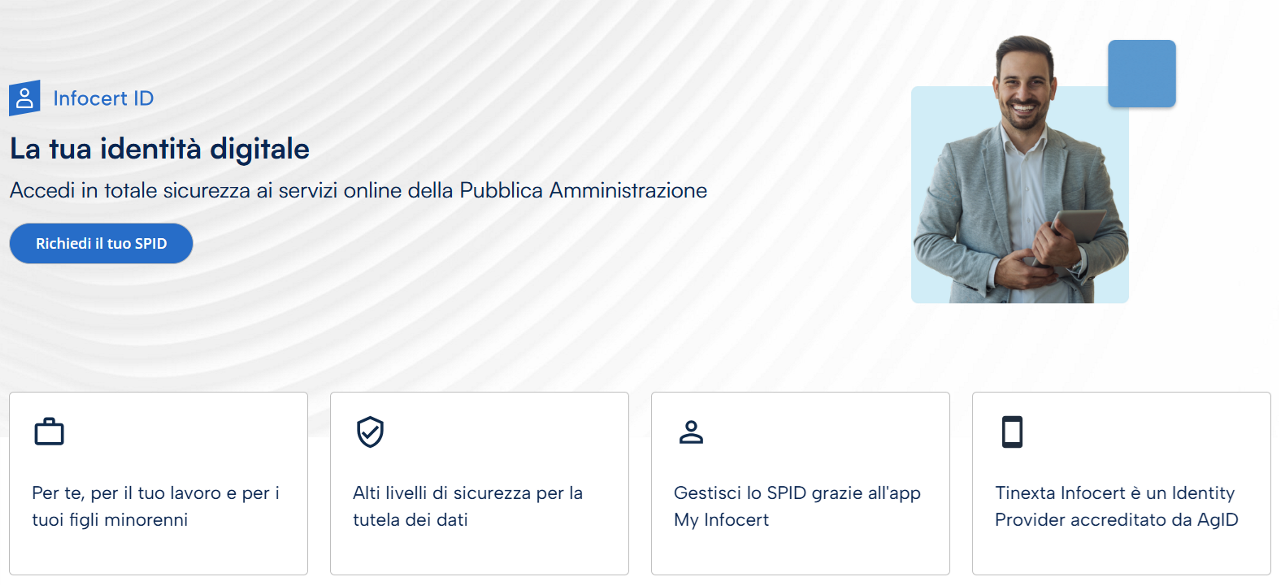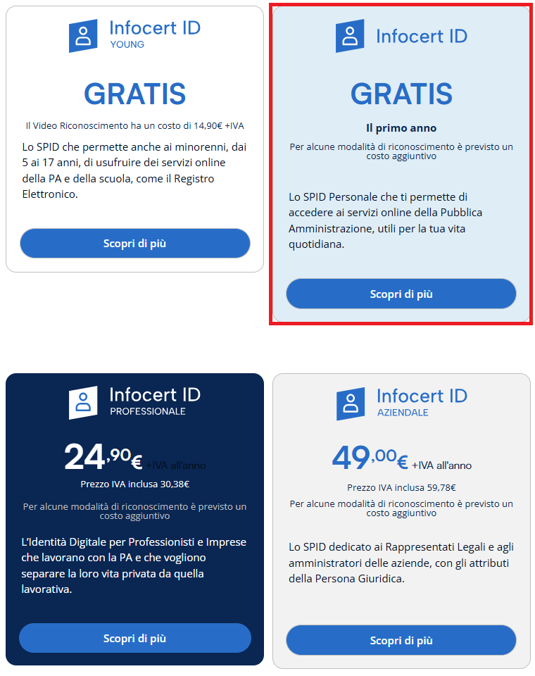 Un clic sul pulsante blu Scopri di più all'interno del riquadro SPID InfoCert ID Personale permette di iniziare il processo di richiesta dell’Identità Digitale.