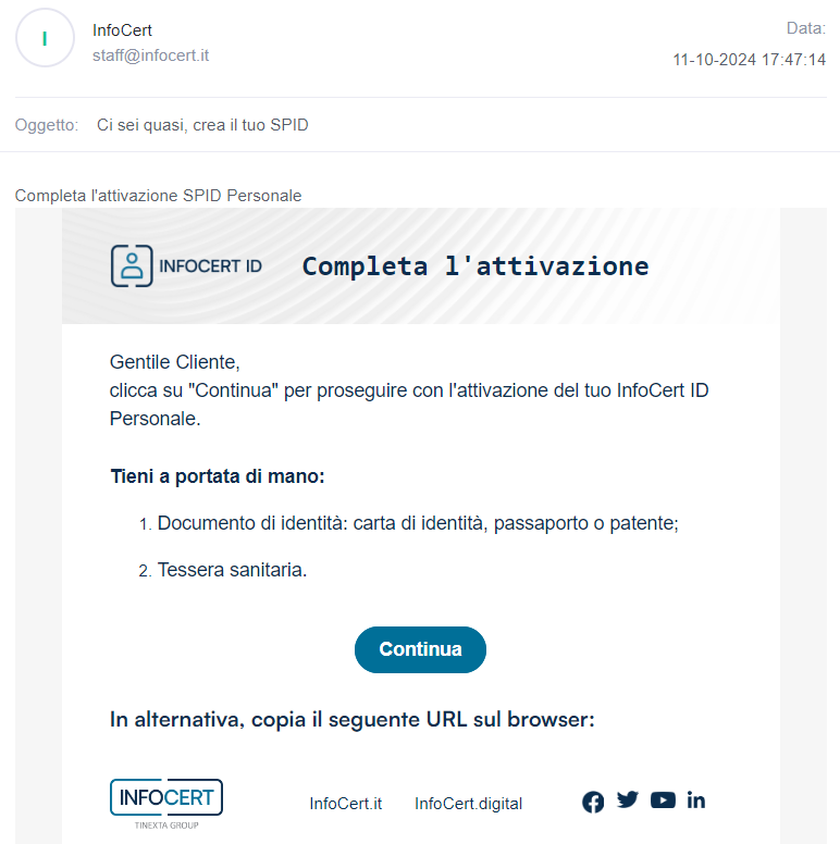 Questa mail fornisce il link per accedere alla fase di registrazione e attivazione del tuo futuro account SPID InfoCert ID.