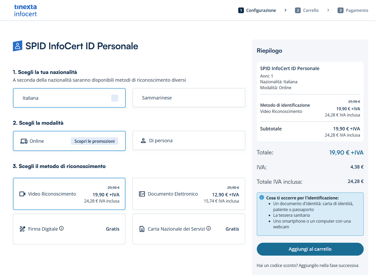 Una volta selezionato il tipo di riconoscimento, verrà richiesto il tipo di account Area Clienti InfoCert da utilizzare per concludere l’acquisto.
