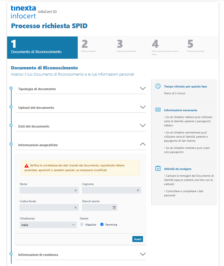 Dopo aver controllato che il documento di riconoscimento sia stato correttamente inserito, il sistema riporterà automaticamente alcuni dei dati presenti sul documento.