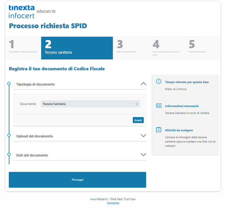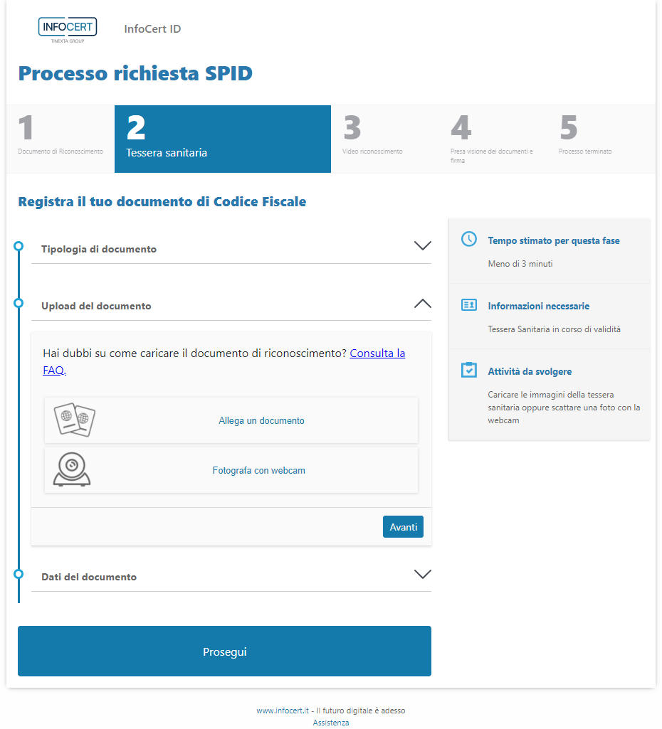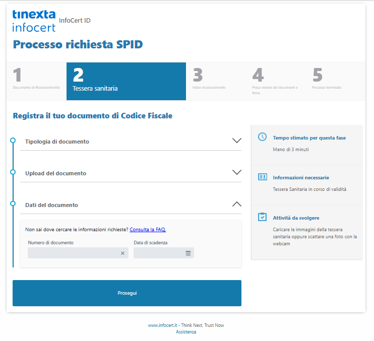 Cliccando su Prosegui si accede alla "Fase 2: Tessera Sanitaria".