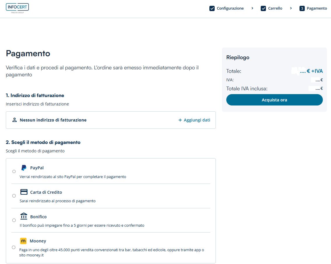 Eseguito l'accesso su InfoCert, la procedura di acquisto passa per la selezione del metodo di pagamento che si intende utilizzare tra quelli presenti in pagina.