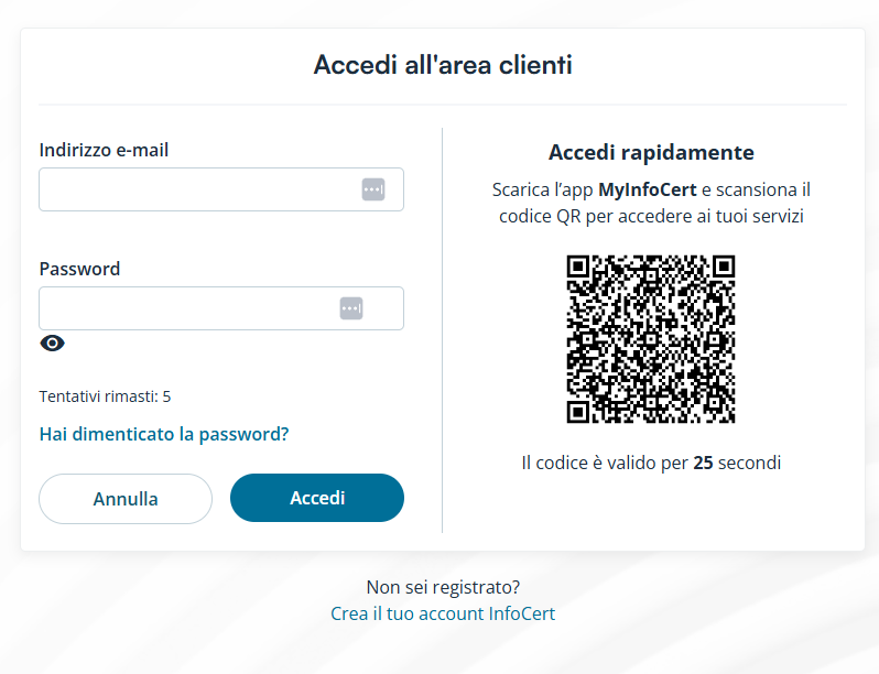 Se hai già acquistato dei servizi sul Negozio InfoCert e si è in possesso delle credenziali di accesso all'Area Clienti InfoCert, inseriscile nei campi indicati (oppure scansiona il QR Code con l’App My Infocert) e fai clic su Accedi.