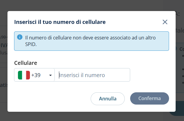 ATTENZIONE: se sei già in possesso di un'identità SPID attiva, non puoi utilizzare il numero di cellulare ad essa associata perchè il sistema impedisce la creazione di più identità SPID associate ad un numero univoco.