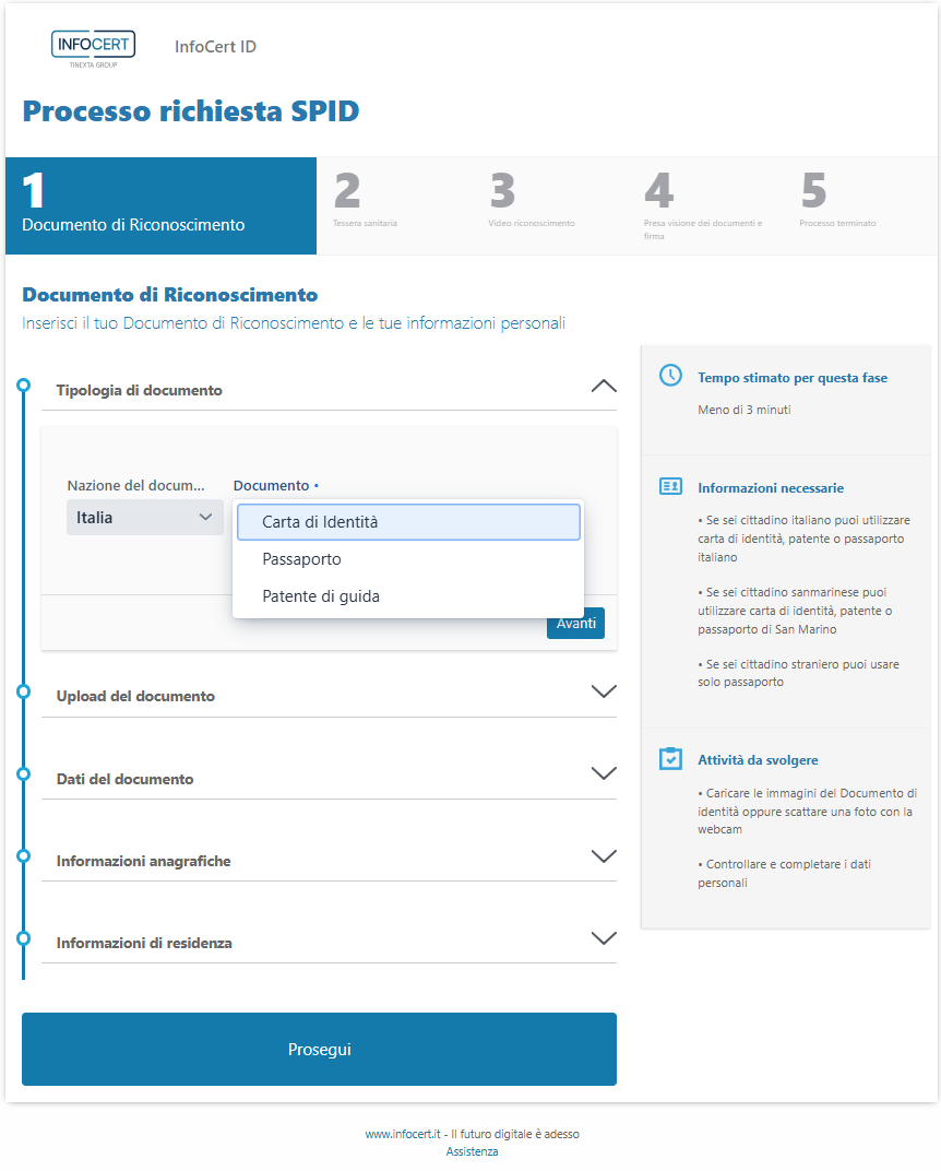 La FASE 1 consiste nell’inserimento del proprio "Documento di Riconoscimento" con il quale ci si vuole registrare, che può essere: