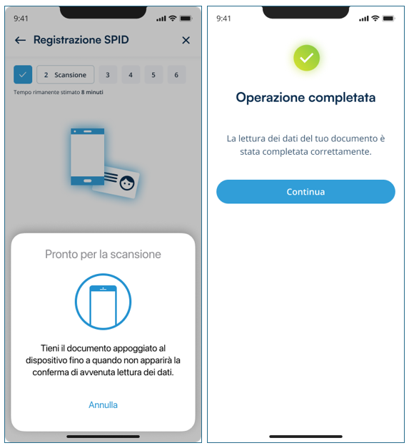 La fase successiva è caratterizzata dallo scambio dei dati con modalità NFC tra lo smartphone e il documento.
