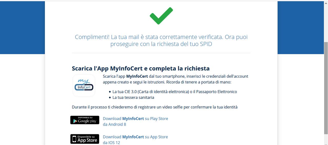 Cliccando sul link, la mail verrà verificata e si potrà proseguire nella richiesta SPID scaricando o avviando l’App My Infocert.