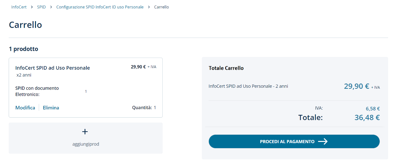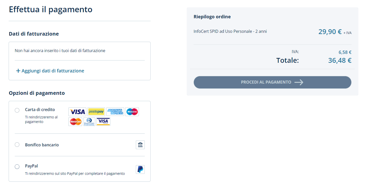 Nella schermata successiva verrà confermato il metodo di riconoscimento selezionato e si potrà continuare cliccando su Procedi al pagamento.
