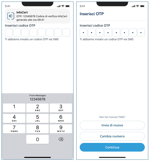 Eseguiti i controlli di routine, InfoCert invia via SMS un codice OTP (sul telefono dichiarato al momento della registrazione) che dovrà essere inserito negli appositi spazi.