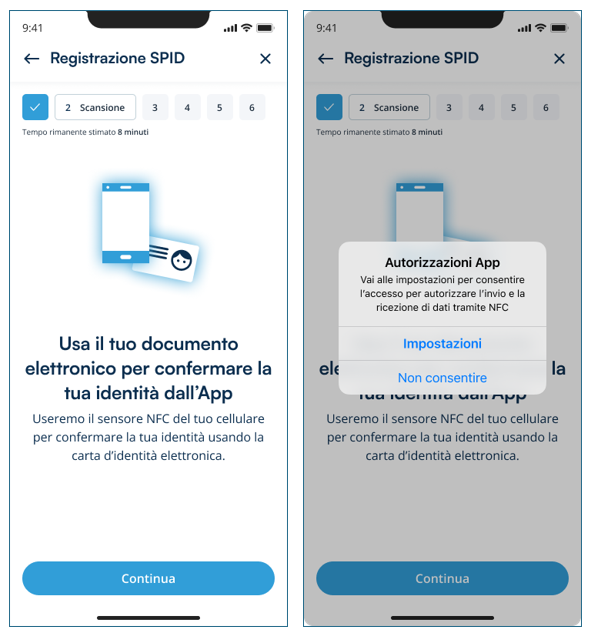 Dopo aver consentito preventivamente all’App l’invio e la ricezione dei dati tramite NFC, si dovrà avvicinare lo smartphone alla parte anteriore del documento.
