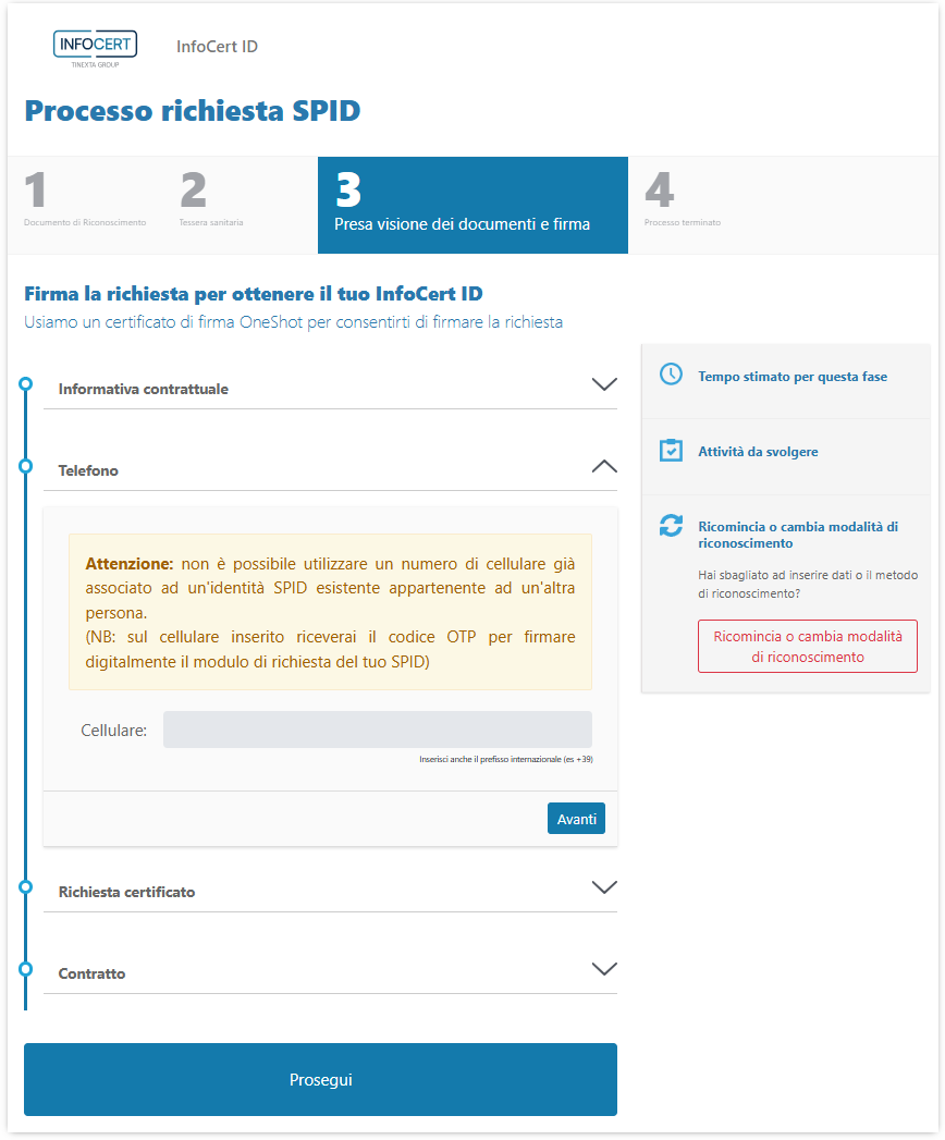 Inserisci il numero di cellulare (+39) sul quale riceverai l'OTP che ti consentirà di firmare il contratto di richiesta SPID.