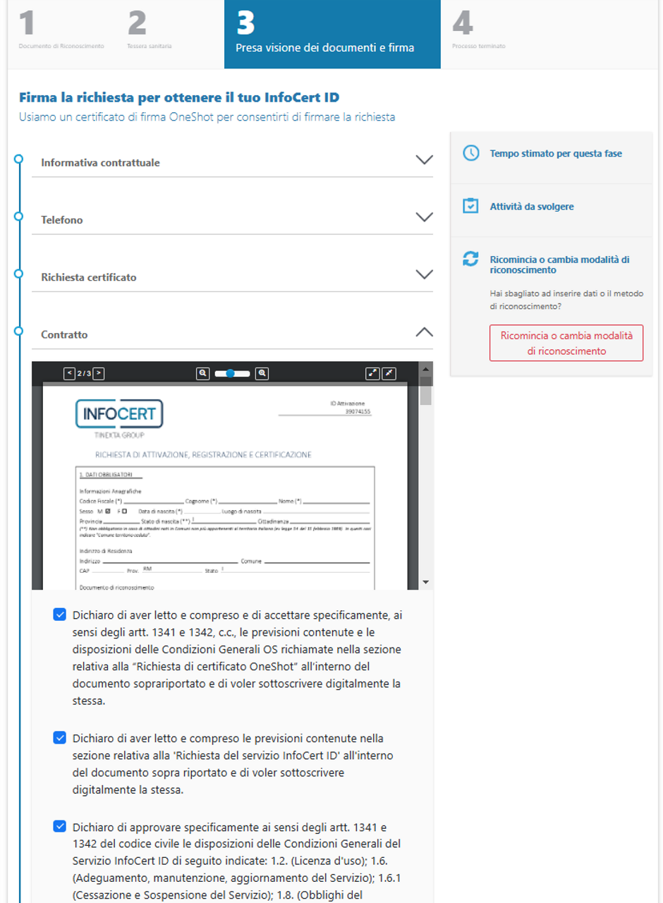 Nella Fase 3, ti viene richiesto di firmare (*) la richiesta dichiarando di aver preso visione della documentazione contrattuale mostrata a schermo.