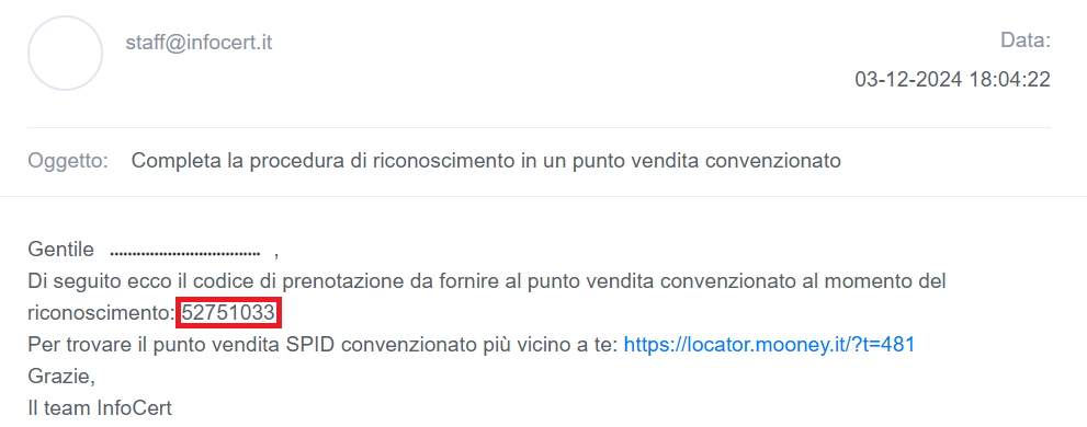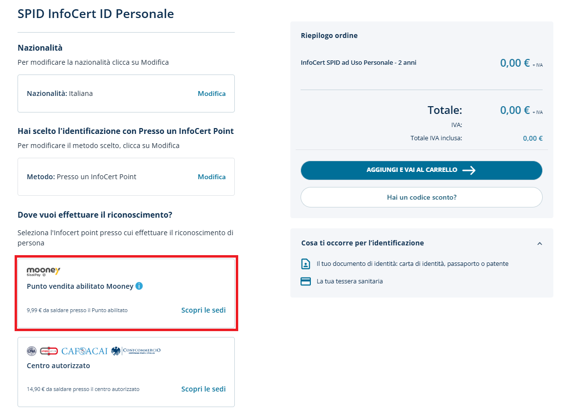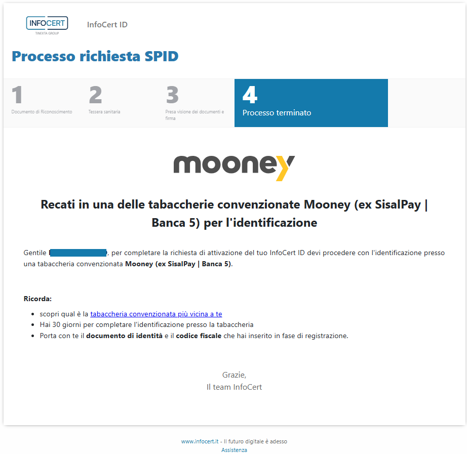 ATTENZIONE: quando ti recherai al punto convenzionato Mooney per completare la fase di riconoscimento ricorda di fornire all'incaricato, oltre al numero di prenotazione, gli stessi documenti caricati nella fase di registrazione su InfoCert.