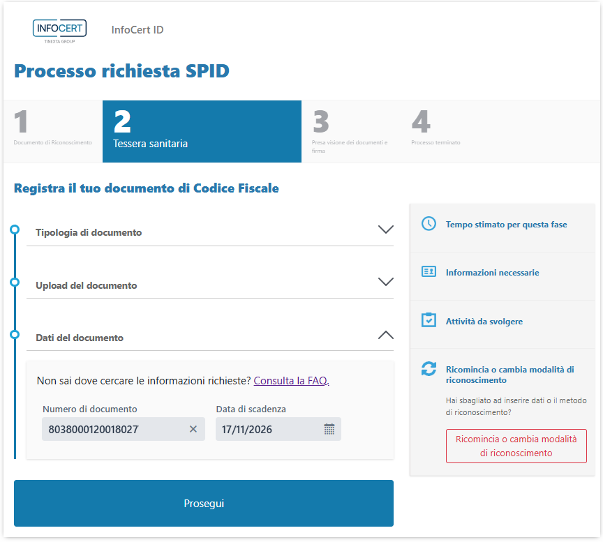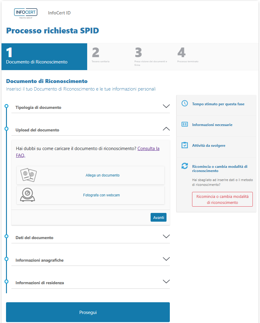 Una volta caricato, il sistema riporterà automaticamente alcuni dei dati presenti sul documento. Sarà necessario inserire manualmente quelli mancanti negli step successivi, così come i dati anagrafici e quelli inerenti la propria residenza.