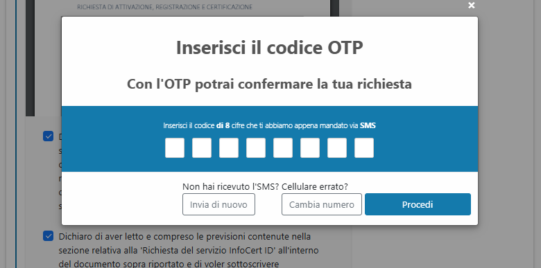 Controlla l'SMS ricevuto sul numero di cellulare appena inserito. Qui, troverai un codice OTP di 8 cfire (cd. certificato digitale di firma One-Shot) da inserire nel riquadro presente a schermo.