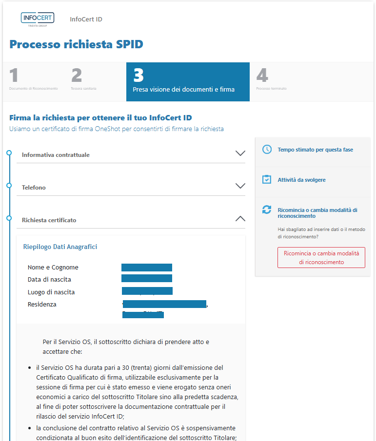 Hai completato la fase di registrazione dei tuoi dati per la richiesta di SPID InfoCert ID Personale.