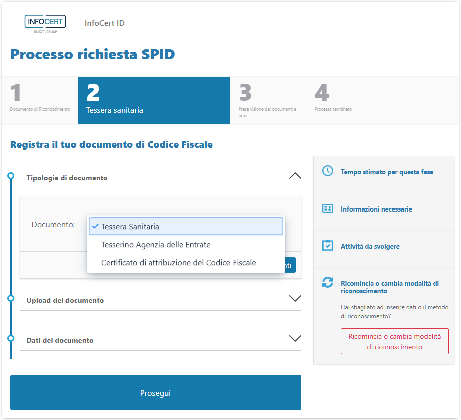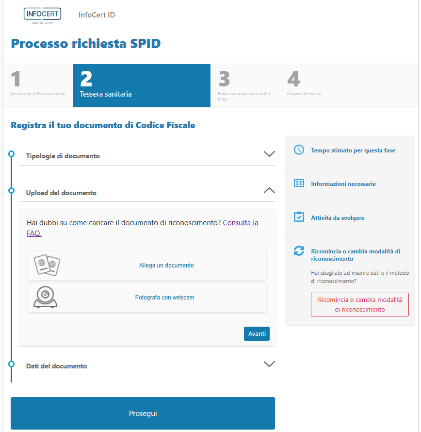 La Fase 2 consiste nel caricamento del documento di Codice Fiscale (a scelta tra: Tessera Sanitaria, Tesserino Agenzia delle Entrate, Certificato di attribuzione del Codice Fiscale) la cui immagine può essere fotografata con la webcam del Pc o allegata se già disponibile sul proprio computer.