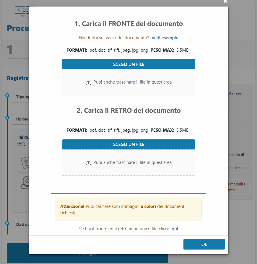Se si hanno a disposizione le immagini fronte-retro su un unico file, è possibile utilizzare il link Clicca qui disponibile in fondo alla finestra.