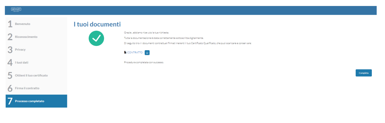 Cliccando su Procedi, il processo risulterà completato e sarà possibile scaricare il contratto.