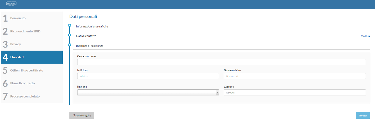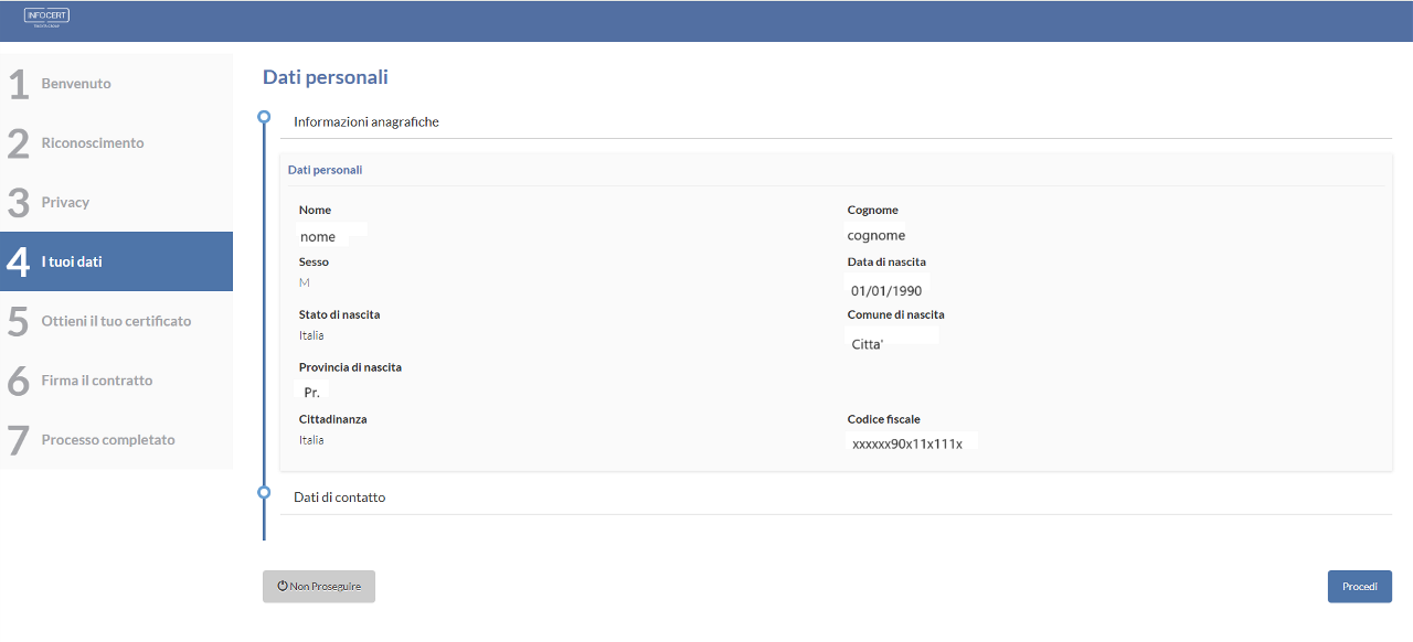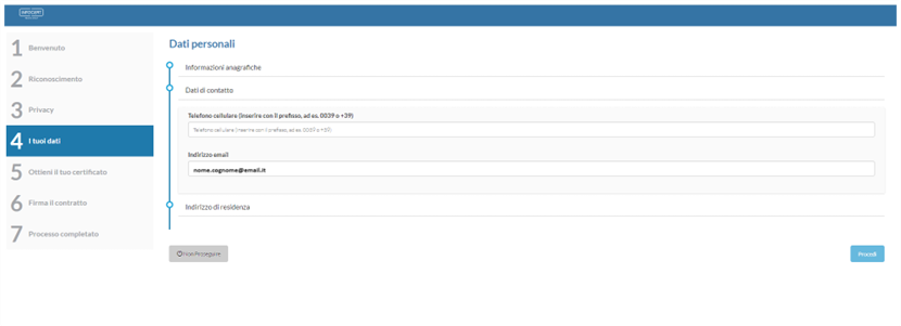 Verranno poi richiesti i dati di contatto: telefono cellulare e indirizzo e-mail. Un click sul tasto Procedi permette di passare allo step successivo.