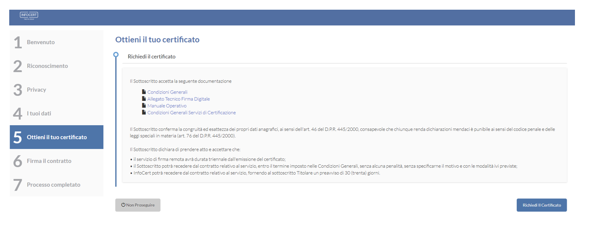 Sarà necessario cliccare sul tasto Richiedi il Certificato per passare allo step successivo.