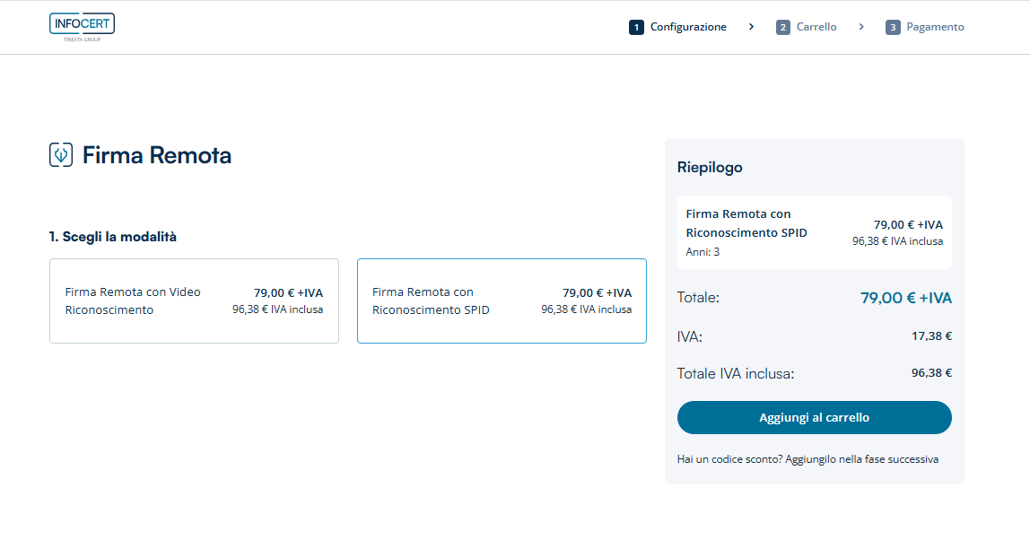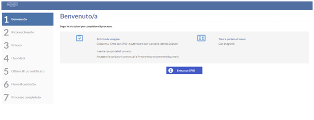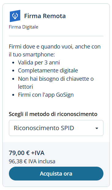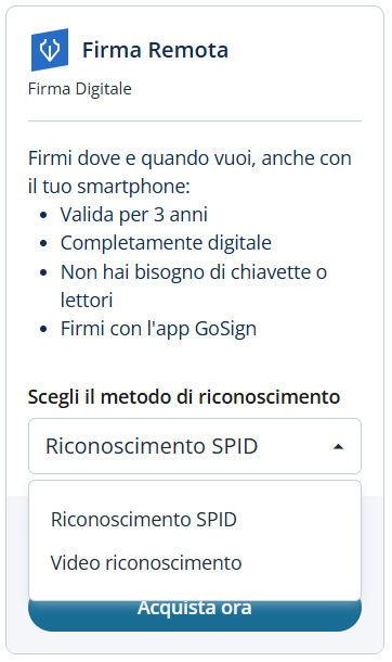 All’interno del sito InfoCert, nella sezione dedicata all’acquisto dei certificati di Firma Digitale, è possibile acquistare una Firma Remota scegliendo, come opzione di attivazione, il riconoscimento tramite SPID.