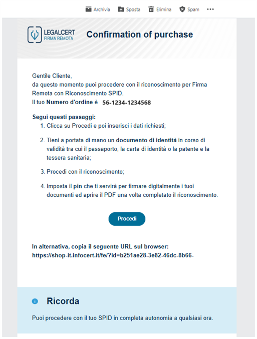 In alternativa è possibile proseguire in altro momento attraverso il link e le istruzioni ricevute via email.