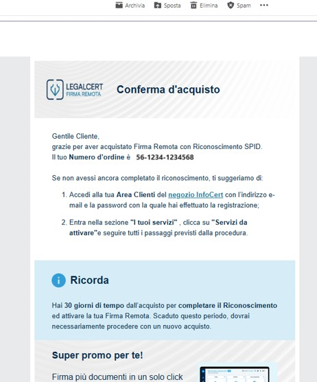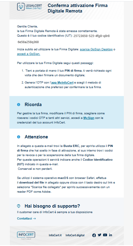 Nell’email fornita si riceverà la conferma di attivazione della Firma Remota. La fase successiva consiste nell’apertura della busta virtuale contenente i codici di emergenza del certificato.