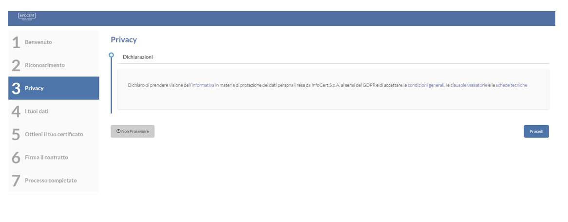 Il punto 3 della procedura di riconoscimento richiede l’accettazione della Privacy da parte dell’utente.