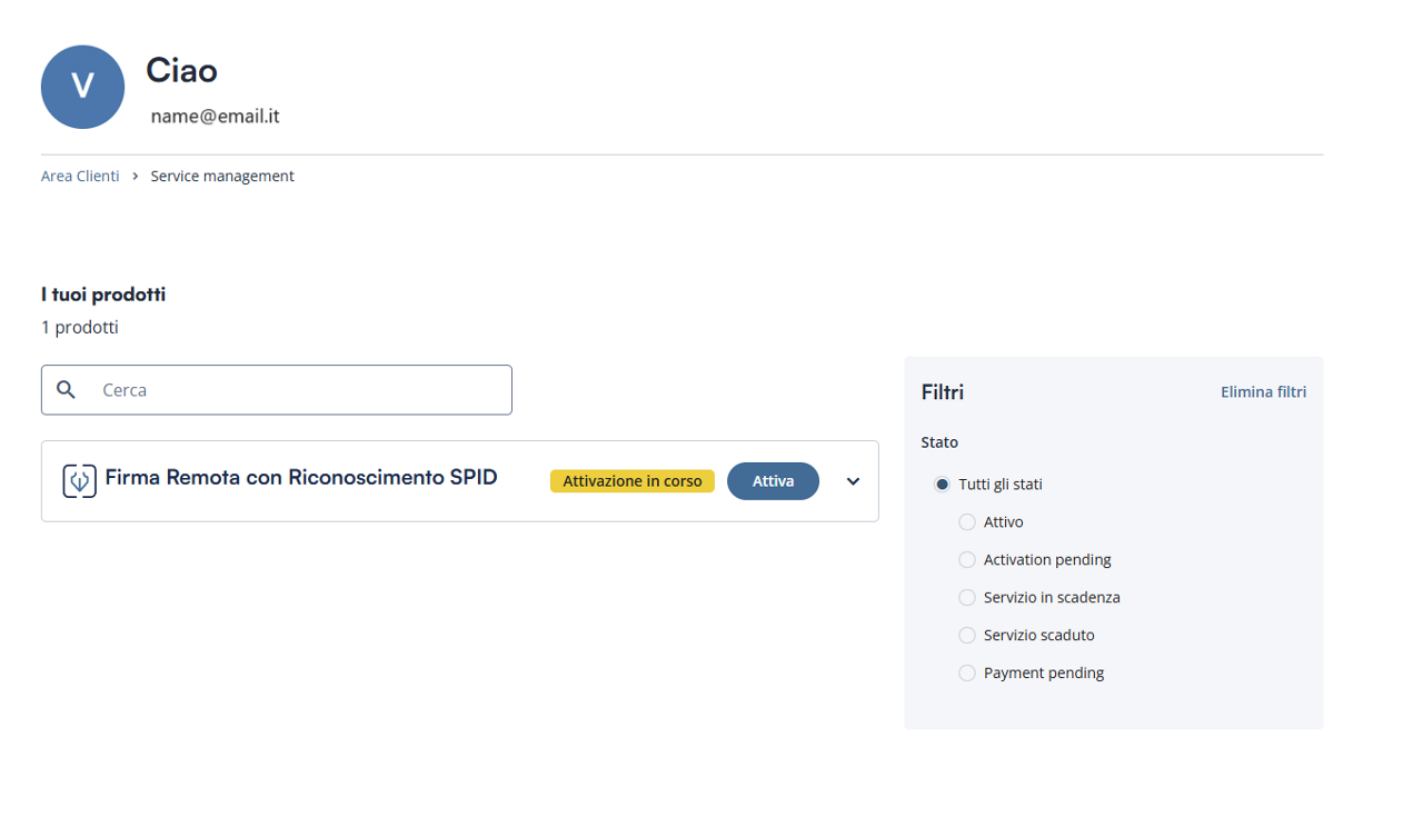 All’interno della propria Area Clienti sul sito InfoCert, sarà visualizzabile il prodotto appena acquistato in stato “Attivazione in corso”, quindi cliccare su Attiva per arrivare al riconoscimento SPID.