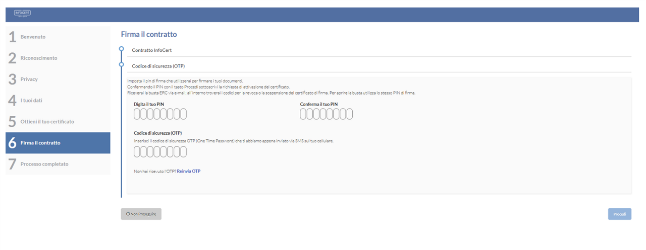 Il punto 5 permette di prendere visione delle condizioni generali relative alla firma OneShot tramite OTP che verrà ricevuto via SMS e che permetterà di firmare la richiesta di attivazione del certificato.