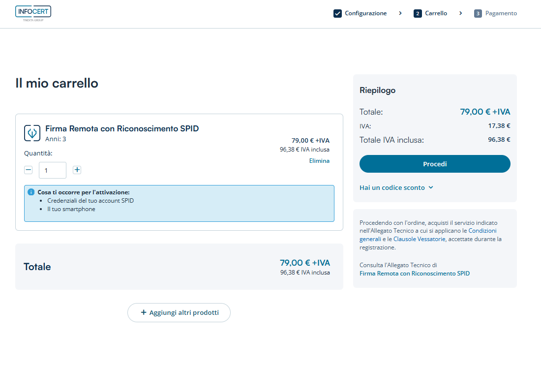 Dopo aver inserito il servizio nel carrello cliccare sul tasto Procedi.