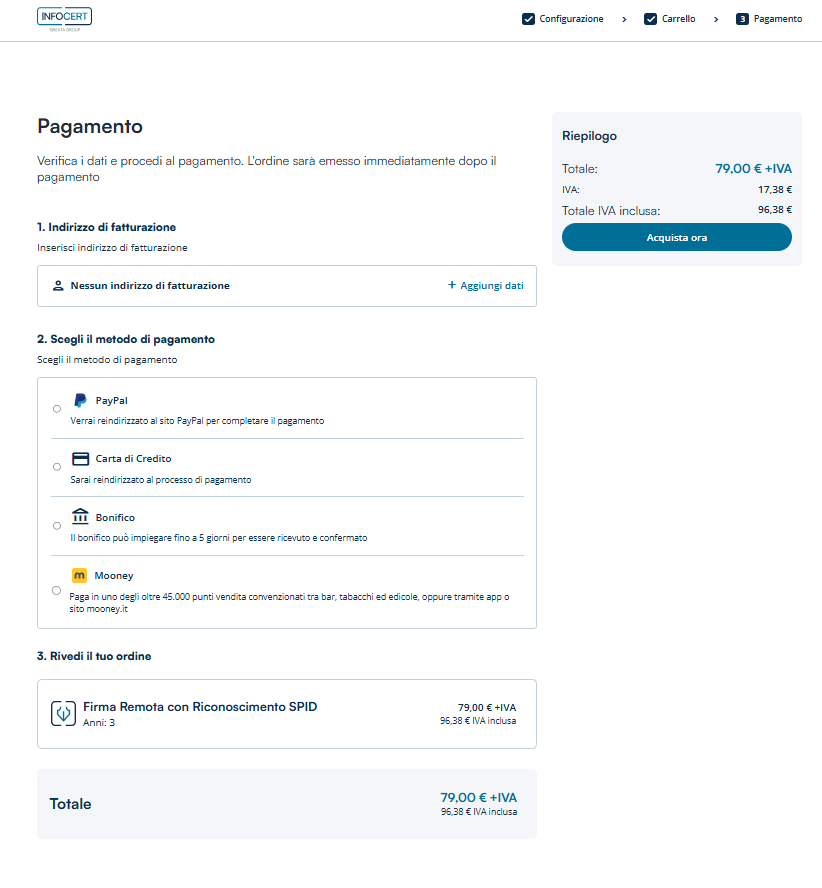 Per completare l'acquisto della Firma Digitale scegliere il metodo di pagamento (Carta di credito, Mooney, PayPal, Bonifico bancario), se non presenti inserire i dati di fatturazione da +Aggiungi dati di fatturazione.