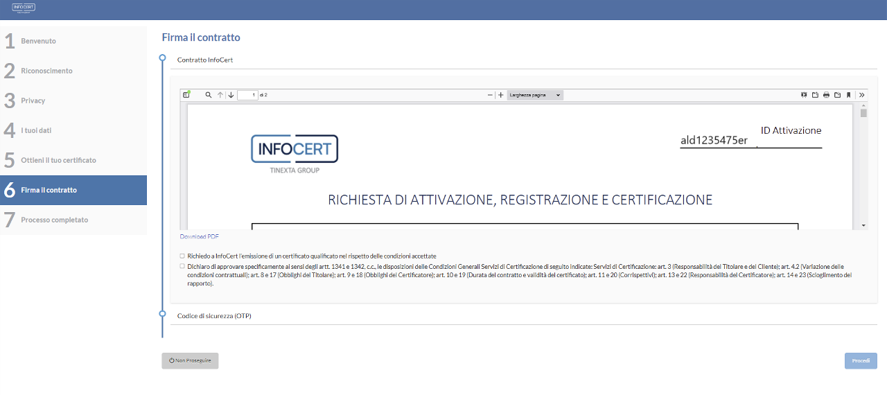 Mettere le due spunte e cliccare sul tasto Procedi per arrivare al passaggio seguente relativo alla firma del contratto.
