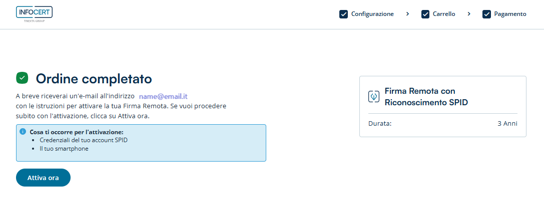 Dopo l’inserimento / conferma dei dati di fatturazione ed aver eseguito l’acquisto, questo verrà confermato e sarà possibile cliccare sul tasto Attiva ora per procedere con l’attivazione.
