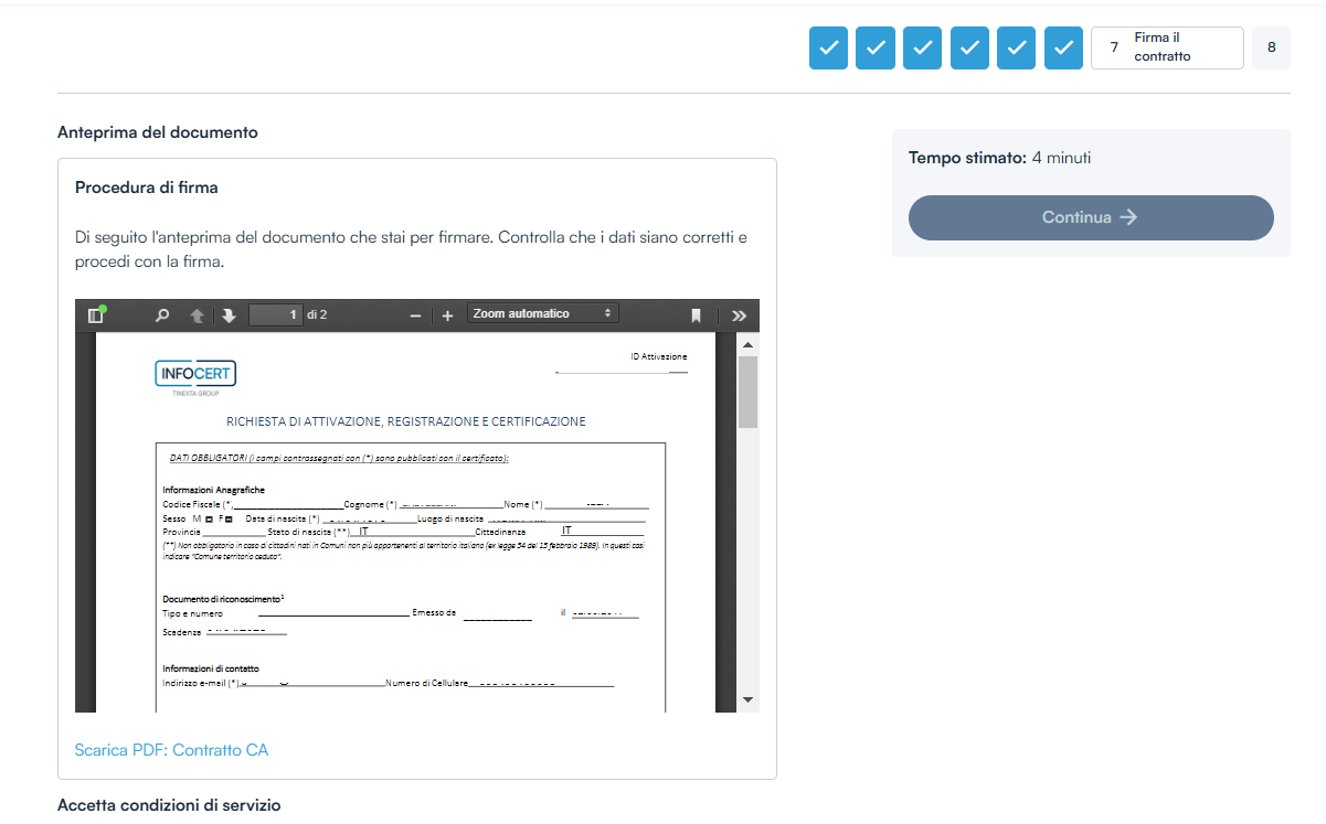 Sarà necessario accettare tutte le Condizioni di Servizio presenti nella schermata e cliccare sul tasto Continua.