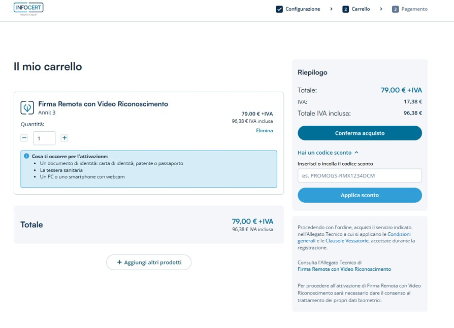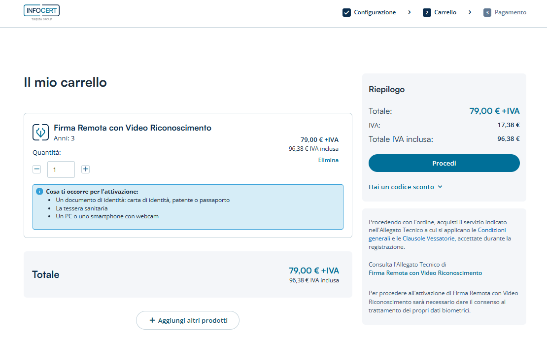 A questo punto il sistema permetterà di proseguire cliccando su Aggiungi al carrello.