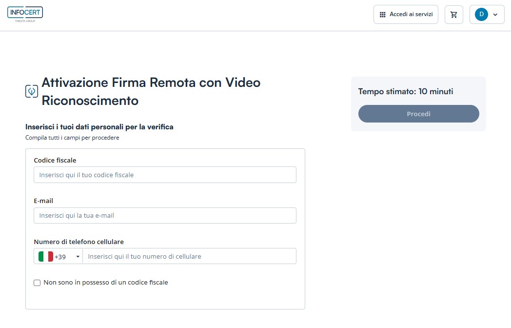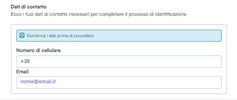 Per la verifica di riconoscimento si richiede l’inserimento dei dati personali: Codice Fiscale, e-mail e telefono cellulare.