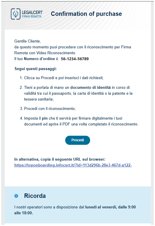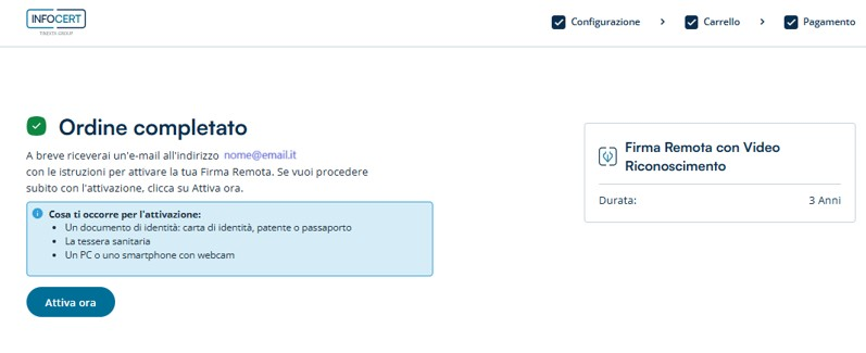 Effettuato l’acquisto, verrà inviata una e-mail all’indirizzo email utilizzato, contenente tutte le istruzioni per completare la procedura